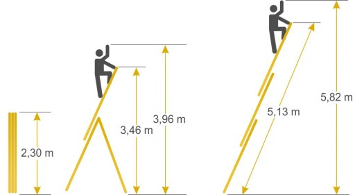 Ponadto masz możliwość rozłożenia drabiny na schodach i pochyłościach terenu. Przy niewielkich wymiarach transportowych (2,30 m) sięgniesz z niej do wysokości ok. 5,82 m.