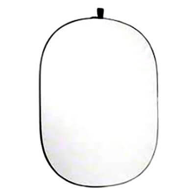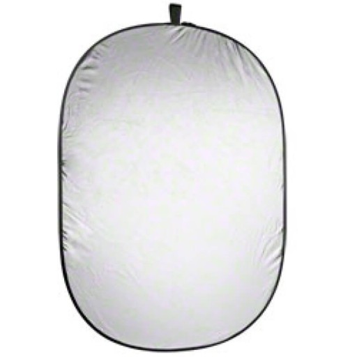 Duża blenda fotograficzna 5w1 MITOYA w kształcie elipsy o wymiarach 100 × 150 cm. Potocznie występująca też jako "blenda owalna" składa sie z pięciu powierzchni: wewnętrznego dyfuzora na stałe rozpiętego na stelażu, trzech powierzchni odbijających - złotej, białej i srebrnej - oraz powierzchni czarnej, służącej odcięciu niechcianego światła.