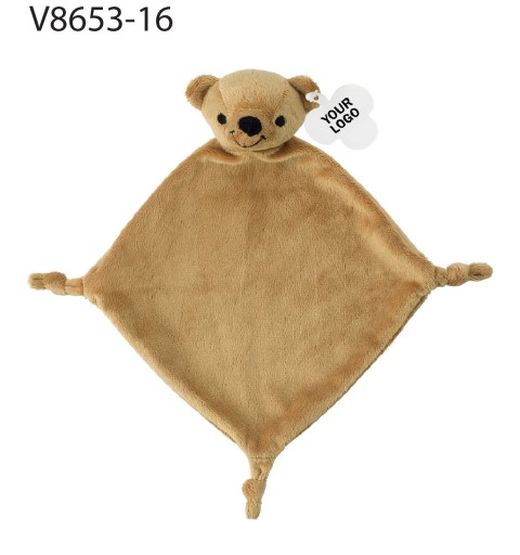 Pluszowy mini kocyk z węzłami na rogach i głową zwierzątka, etykieta pod personalizację.
