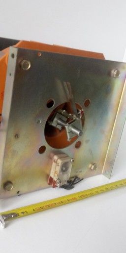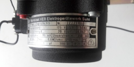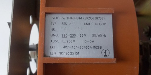 Autotransformator VEB, model ESS310, zasilany napieciem 220V (można również zasilać 125V, lub 250V), napiecie wyjściowe 0 - 250V, prąd ciągły 5A (10A dorywczo). Średnica transformatora 175mm, wysokość 80mm. Autotransformator jest napędzany motoreduktorem jednofazowym, zasilanym napięciem przemiennym około 24 - 30V AC, z kondesatorową fazą rozruchową, podłączenie jak typowy silnik jednofazowy z kondensatorem, podobnie zresztą odbywa sie zmiana kierunku obrotu motoreduktora (autotransformatora), ale można również bez problemu ustalać pozycję autotransformatora ręcznie. Autotransformator pracował w pozycji jak na ostatnim zdjęciu, wtedy obrót w prawo, powoduje zwiększanie napięcia na wyjściu S. Waga 10,5kg. Urządzenie przetestowane, w pełni sprawne