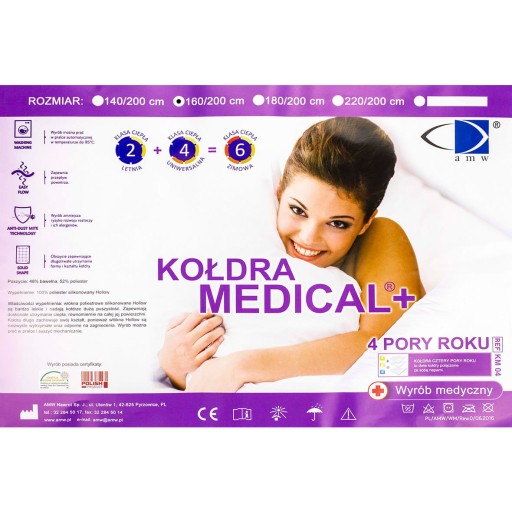 Kołdra 180x200 Medical Cztery Pory Roku AMW Antyalergiczna jest linią uniwersalnych kołder polecanych na każdą porę roku. To kołdry składające się z dwu spinanych ze sobą warstw. Do dyspozycji mamy zatem kołdrę lekką i cienką lub też bardzo ciepłą kołdrę zimową. Są niezwykle lekkie i przewiewne, a jednocześnie doskonale utrzymują ciepło ludzkiego ciała. Zapewnią wysoki komfort snu zarówno w upalne dni i ciepłe noce, jak i w sezonie jesienno ? zimowym.