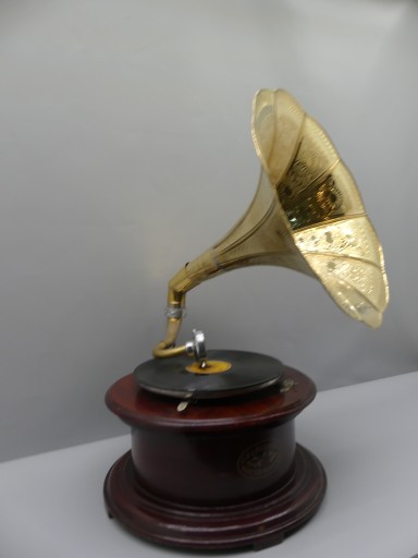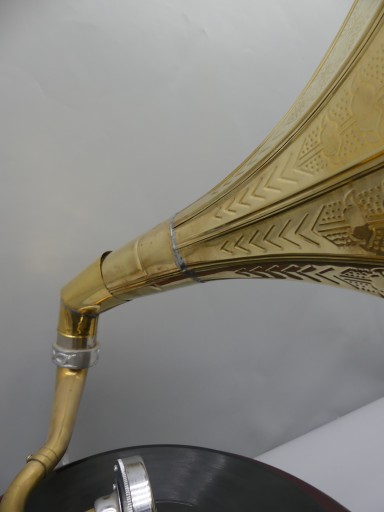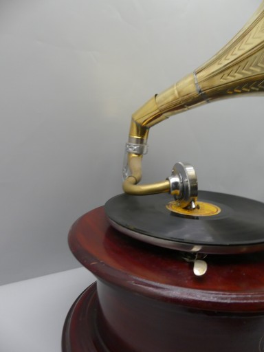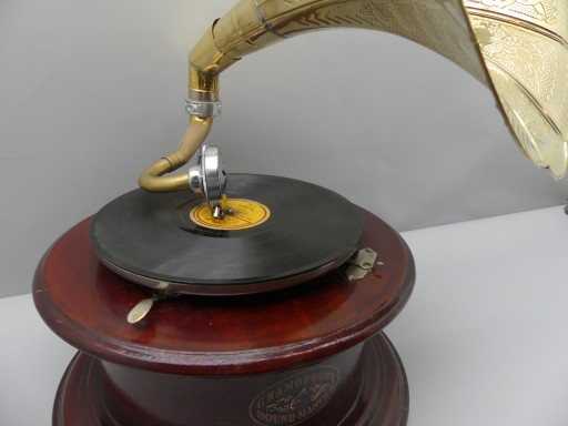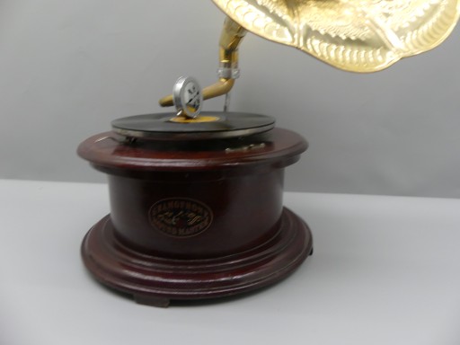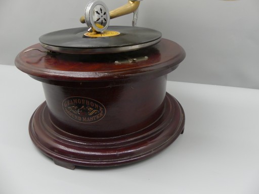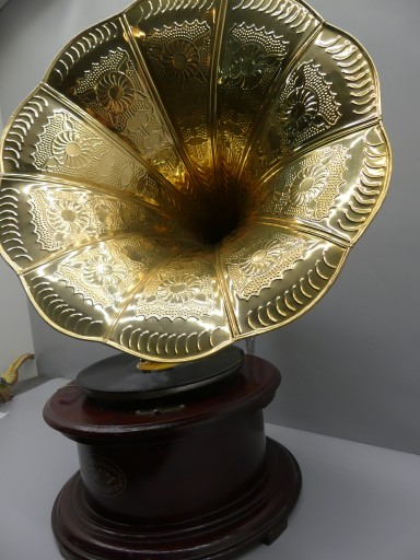 - Pięknie wykonany patefon - połączenie srebrnej tuby z drewnianą podstawą w kształcie okręgu