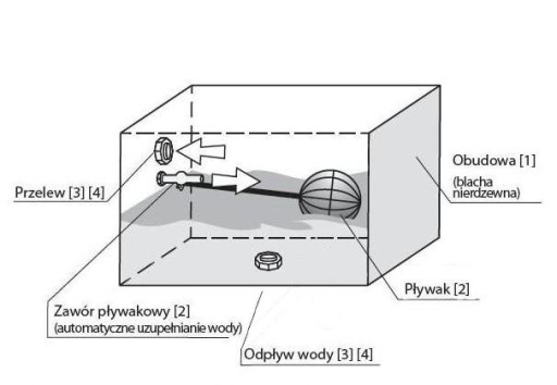 - Pływak: tworzywo sztuczne lub miedź (losowo)