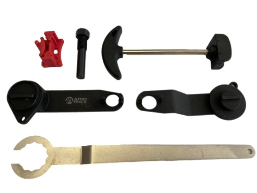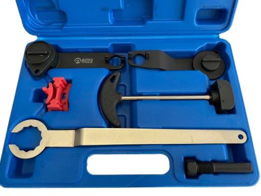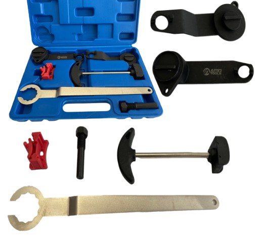 W zestawie znajduje się m.in. blokada wału korbowego, koła zębatego rozrządu, napinacz koła pasowego, trzpień do wału