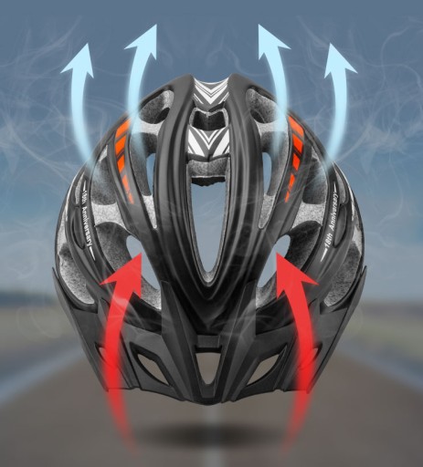 Otwory wentylacyjne i wewnętrzne kanały kierują powietrze do wnętrza kasku oraz zapewniają jego cyrkulację wokół głowy. Większy przepływ powietrza gwarantuje optymalną temperaturę i komfort podczas długich tras w wysokich temperaturach.