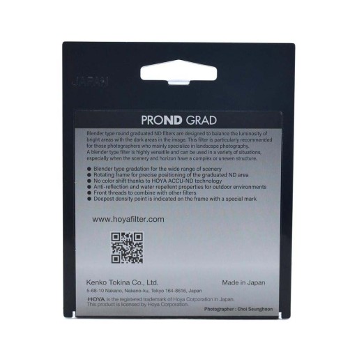 HOYA PROND GRAD stosuje technologię która umożliwia równomierne rozprowadzenie gradacji na całej powierzchni szkła filtra. Jednak aby zachować rzeczywistą wartość gęstości wewnątrz obszaru obrazu, dostosowano efektywny obszar mieszania w taki sposób, aby określona gęstość zaczynała się i zanikała wewnątrz tego obszaru obrazu. Pomoże to fotografom zastosować wymaganą gęstość obrazu w najbardziej efektywny sposób.