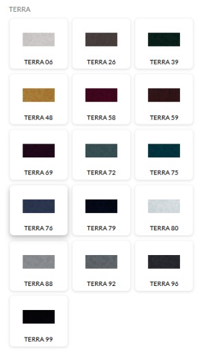 TERRA to przyjemna w dotyku tkanina obiciowa o ciekawej strukturze. Dostępna jest w szerokiej gamie kolorystycznej, a zaawansowana technologia gwarantuje wysoką wytrzymałość.