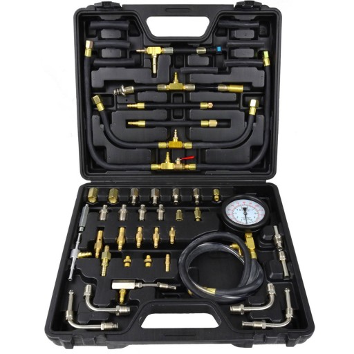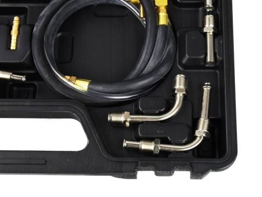 Wielofunkcyjny zestaw do pomiaru ciśnienia spalania benzyny. Zestaw współpracuje z większością samochodów marek japońskich, amerykańskich i europejskich. Zestaw zawiera adaptery i kształtki pasujące do większości układów wtrysku paliwa. Manometr z podwójną skalą: 0 - 140 psi oraz 0 - 10 bar. Długi elastyczny przewód wraz zaworem odpowietrzającym pozwala na bezpieczny pomiar ciśnienia.