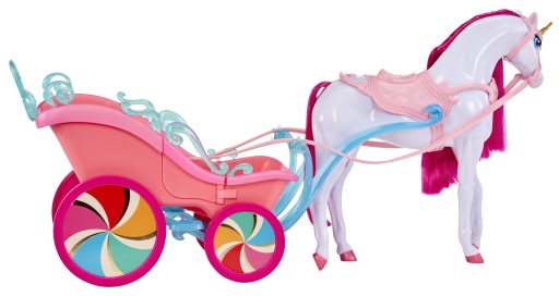Urocza brokatowa karoca przewiezie Candy Prince i Princess z Cukierkowego Zamku po całej Słodkiej Dolinie (zamek i lalki sprzedawane oddzielnie). Zarówno wóz, jak i jednorożec pasują do wszystkich lalek Dream Ella i Dream Bella od firmy MGA.