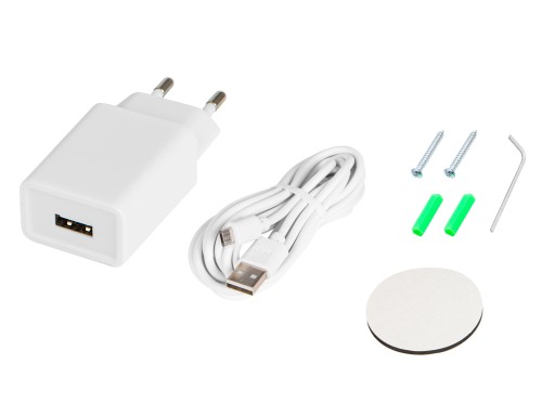 Dedykowany zasilacz DC 5V/2A z kablem microUSB w zestawie z urządzeniem. W opakowaniu znajdziemy także kołki montażowe, instrukcję obsługi.
