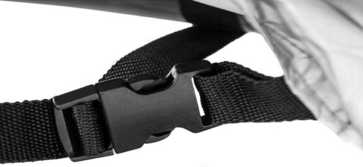 Na dole znajdują się ściągacze oraz pasek z klamrą do spięcia pod motocyklem. Dodatkowo pokrowiec posiada dwa otwory umożliwiające założenie blokady na koło motocykla.