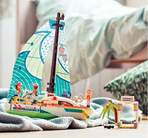 - Co jest w pudełku? W zestawie znajdują się klocki i elementy potrzebne do stworzenia realistycznej łodzi z elastycznym żaglem i linią mety, a także z trzema minilaleczkami LEGO® Friends