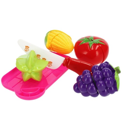 Idealny dodatek do drewnianych kuchenek. Wszystkie Owoce oraz Warzywa podzielone są na dwie części, połączone ze sobą za pomocą rzepów, co imituje proces ich krojenia nożykiem. Po pokrojeniu warzyw na deseczce na pół można je ponownie łączyć ze sobą, co urozmaica zabawę.