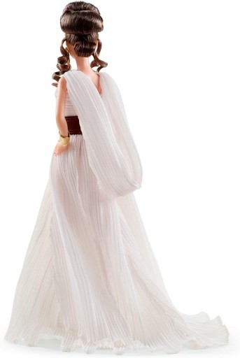 Zainspirowana oryginalną sztuką koncepcyjną filmów, kolekcja Star Wars x Barbie na nowo wyobraża sobie kultowe postacie dzięki charakterystycznemu filtrowi mody Barbie Ta współpraca z Gwiezdnymi Wojnami x Barbie jest hołdem dla Gwiezdnych Wojen i ulubionej przez fanów postaci Rey Lalka Star Wars Rey x Barbie oddaje legendarny wygląd Rey w kryształowej plisowanej szyfonowej sukni z dekoltem krzyżowym i drapowanym kapturem Legginsy i akcesoria ombre o młotkowanym złotym wyglądzie dopełniają jej bohaterski wygląd Lalka Star Wars Rey x Barbie to świetny prezent dla fanów i kolekcjonerów. Zawiera stojak na lalki z Gwiezdnych Wojen i certyfikat autentyczności
