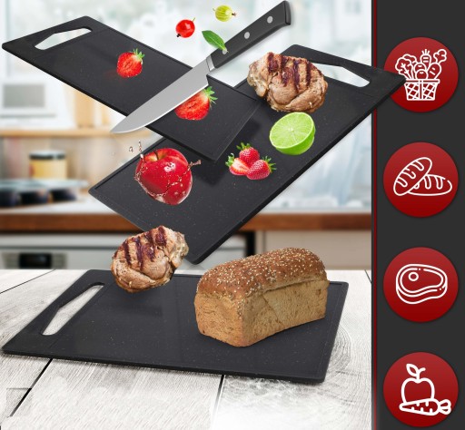 Zestaw desek do krojenia w trzech różnych rozmiarach - S, M oraz L. Zestaw został wykonany w całości z wysokiej jakości tworzywa sztucznego przypominającego granit. Tworzywo jest bezpieczne dla zdrowia i pozbawione szkodliwych substancji (BPA FREE). Powierzchnia desek nie zużywa nadmiernie ostrzy noży oraz nadaje się do mycia w zmywarce.