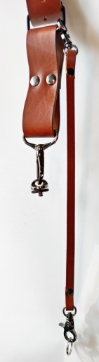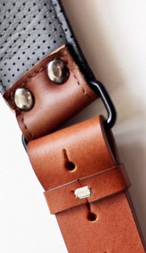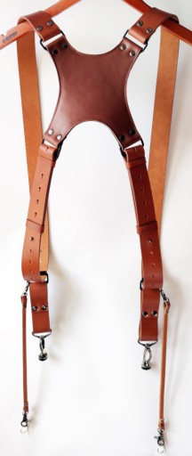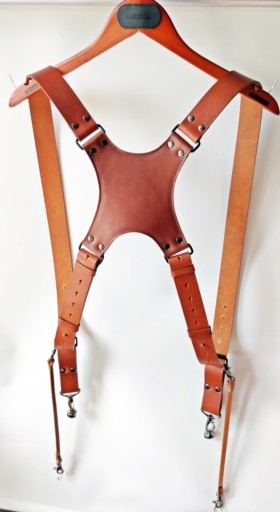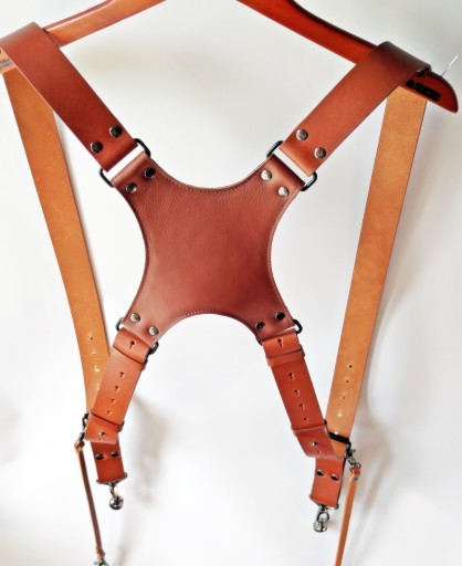 Szelki w kolorze jasny brąz (camel), wykonane ze skóry naturalnej najwyższej jakości z dbałością o najdrobniejszy detal. Krzyżak na plecy dodatkowo od strony wewnętrznej jest podszyty miękką skórą perforowaną. Szelki posiadają bardzo dużą skalę regulacji, także po odpowiednim ustawieniu będą pasować na każdego. Aparat mocowany jest do szelek poprzez uniwersalną śrubę fotograficzną 1/4'' osadzoną na mocnym, metalowym karabińczyku z krętlikiem. Paski asekuracyjne po obu stronach zakończone są także karabińczykami metalowymi w celu sprawnego odpięcia sprzętu. Wykonane są także ze skóry naturalnej co gwarantuje bardzo dobrą ochronę sprzętu jak i dopełnienie wizerunku estetycznego szelek. Całość zamocowana jest na szelkach z wykorzystaniem ramki rymarskiej o grubości 3 mm i paska wykonanego z tej samej skóry z której zostały wykonane szekli. Szerokość szelek - 4 cm a grubość skóry - 3-4 mm. Szelki wykonujemy samodzielnie w małym zakładzie kaletniczym dlatego czas oczekiwania to ok 3 dni roboczych.