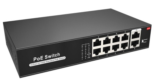 Prezentowany model to uniwersalny, 10 portowy, niezarządzalny switch, wyposażony w 8 portów PoE o maksymalnej prędkości 100 Mb/s i z obsługą standardów IEEE 802.3af/at. Switch również posiada 2 porty RJ45 Uplink o prędkości 100Mbps.