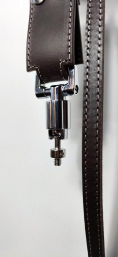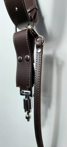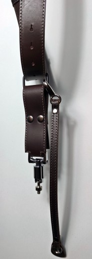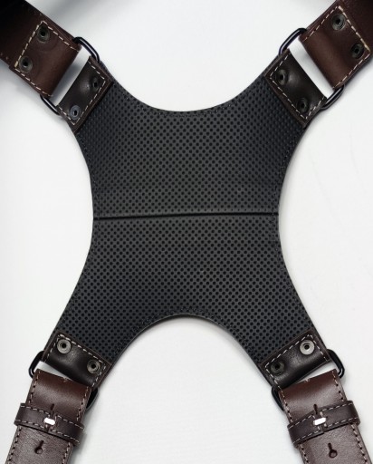 Szelki w kolorze czekoladowym z przeszyciami w kolorze beżowym, wykonane ze skóry naturalnej najwyższej jakości z dbałością o najdrobniejszy detal. Krzyżak na plecy dodatkowo od strony wewnętrznej jest podszyty miękką skórą perforowaną. Szelki posiadają bardzo dużą skalę regulacji, także po odpowiednim ustawieniu będą pasować na każdego. Paski asekuracyjne aparatu także są wykonane ze skóry naturalnej z możliwością odpięcia. Nowością w tym modelu szelek są intuicyjne, bezpieczne i funkcjonalne okucia dedykowane do aparatów ze standardowym gwintem 1/4. Mocowania te pozwalają w szybki i prosty sposób odłączyć aparat od szelek poprzez opuszczenie i przekręcenie tulei sprężynującej i wysunięcie części z gwintem osadzonym w wewnątrz mocowania. Część z gwintem podczas użytkowania umożliwia swobodne obracanie aparatu o 360*. Szerokość szelek 4 cm. Grubość skóry ok 4 mm. Szelki wykonujemy samodzielnie w małym zakładzie kaletniczym dlatego czas oczekiwania to ok 3 dni roboczych.