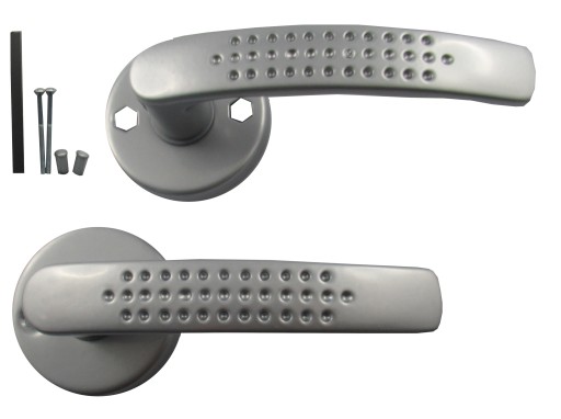 Klamka drzwiowa, metalowa SANDRA do drzwi wewnętrznych oraz zewnętrznych wraz z dolną rozetą.