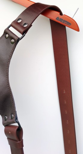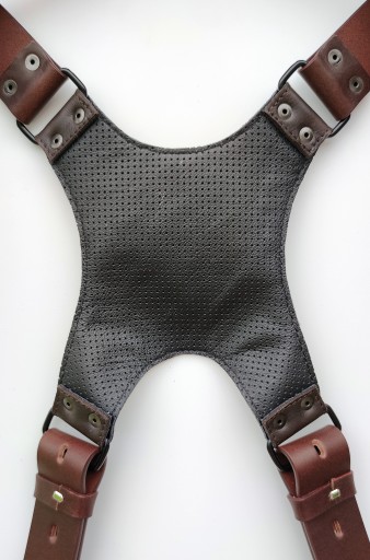 Szelki w kolorze ciemno brązowym, wykonane ze skóry naturalnej najwyższej jakości z dbałością o najdrobniejszy detal. Krzyżak na plecy dodatkowo od strony wewnętrznej jest podszyty miękką skórą perforowaną. Szelki posiadają bardzo dużą skalę regulacji, także po odpowiednim ustawieniu będą pasować na każdego. Aparat mocowany jest do szelek poprzez uniwersalną śrubę fotograficzną 1/4'' osadzoną na metalowym karabińczyku z krętlikiem. Paski asekuracyjne są wykonane także ze skóry naturalnej co gwarantuje bardzo dobrą ochronę sprzętu jak i dopełnienie wizerunku estetycznego szelek. Całość zamocowana jest na szelkach z wykorzystaniem ramki rymarskiej o grubości 3 mm i paska wykonanego z tej samej skóry z której zostały wykonane szekli. Szerokość szelek - 4 cm a grubość skóry - 3-4 mm. Szelki wykonujemy samodzielnie w małym zakładzie kaletniczym dlatego czas oczekiwania to ok 3 dni roboczych.