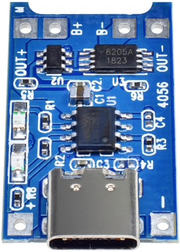 Przedmiotem sprzedaży jest moduł ładowarki Li-Ion oparty o TP4056 z układem zabezpieczającym ogniwo. Moduł wyposażony jest w złącze USB-C.