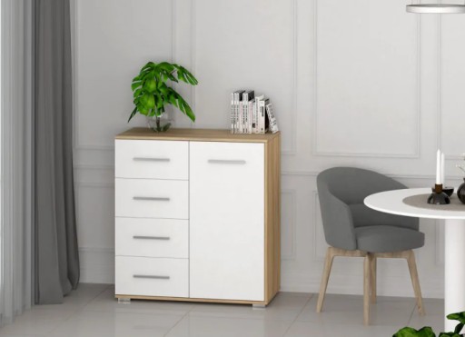 Kolorystyka komody to korpus w kolorze sonoma z frontami białymi w macie. Prostota jak i doborowe wykonanie, sprawi, że będzie nie tylko praktycznym meblem w salonie ale również ozdobą pokoju.