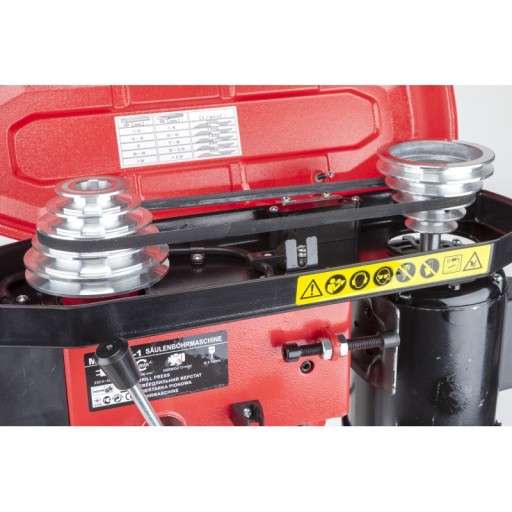 Jedną z pięciu prędkości obrotowych wybieramy poprzez przełożenie paska na kołach pasowych, który znajdziemy po uniesieniu górnej pokrywy.