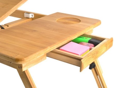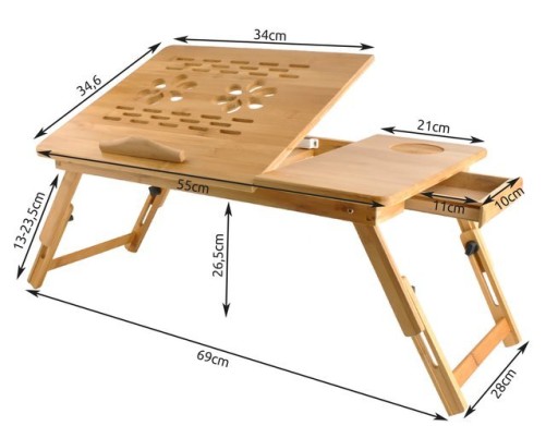Stolik pod laptopa z wentylacją to nie tylko regulowany blat pod komputer, ale również dodatkowy blat, na którym możemy postawić szklankę czy zeszyt z notatkami. Drewniany stolik pod laptopa zawiera ponadto bardzo praktyczną, małą szufladkę, w której możemy schować niewielkie, podręczne akcesoria – np. notes, długopis, pendrive czy słuchawki itp.