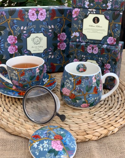 Linia wykonana z białej porcelany zdobionej kompozycją delikatnych, pastelowych kwiatów, liści oraz gęstwiny gałązek na stonowanym, eleganckim szaro-błękitnym tle. Ta botaniczna kombinacja to typowy ornament charakterystyczny dla Kilburna.