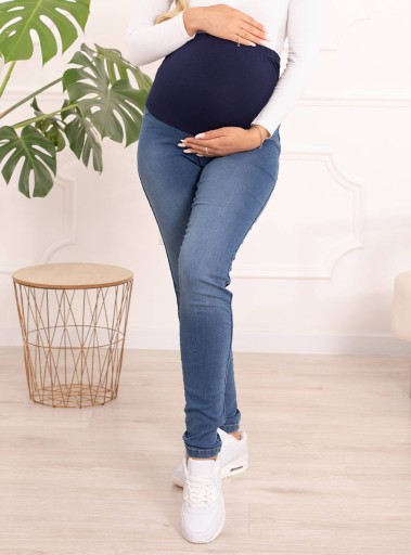 Dżinsy ze spranego elastycznego denimu. Z z tyłu kieszenie, w talii Spodnie posiadają wszyty bez uciskowy panel który doskonale dopasowuje się do brzucha. Obcisłe nogawki. Spodnie nadają się świetnie do noszenia w ciąży jaki i zaraz po niej , kiedy to jeszcze dochodzisz do swojej figury.