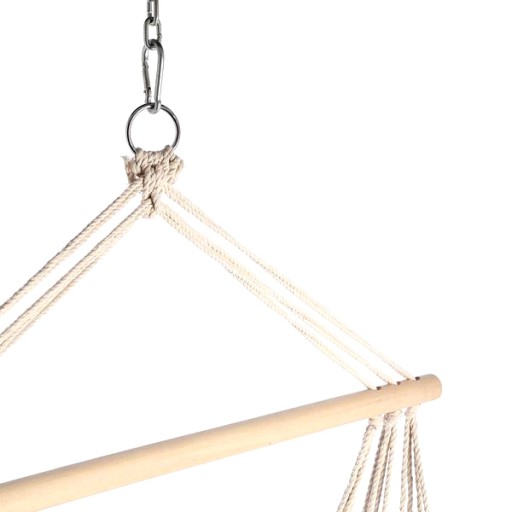 NC3101, wykonany jest, z przyjemnego w dotyku, oddychającego płótna, które jest jednocześnie bardzo wytrzymałe i odporne, na warunki atmosferyczne oraz jakiekolwiek przetarcia. W połączeniu, z grubo plecionymi, mocnymi linami, solidnym drewnianym stelażem oraz metalowym uchwytem, otrzymujemy maksymalne dopuszczalne obciążenie, na poziomie 120 kg