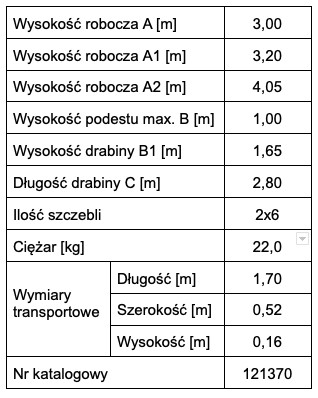 - Rusztowanie drabinowe aluminiowe składające się z dwóch 6-szczeblowych drabin przystawnych z szerokimi stabilizatorami u podstawy oraz platformy roboczej.
