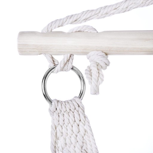 Hamak jest wykonany z naturalnych materiałów – naturalna bawełna jest miękka w dotyku i zapewnia przepuszczalność powietrza, drewniana belka zapewnia stabilność siedziska.