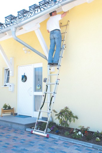 Trzyelementowa drabina wielofunkcyjna. Do zastosowania jako drabina rozsuwana, przystawna, wolnostojąca i na schody.