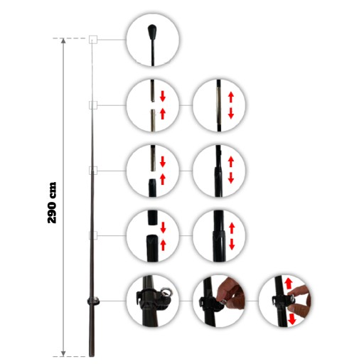 Długość masztu po złożeniu wynosi 290cm , natomiast po zamontowaniu i naciągnięciu flagi, całość ma wysokość około 260cm . Dolna krawędź flagi znajduje się około 60/70 cm od ziemi.