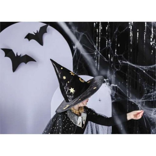 Piękny kapelusz wiedźmy/czarodzieja w kolorze czarnym ze złotymi zdobieniami, średnica otworu na głowę 19 cm, średnica ronda 42 cm, wysokość 32 cm.