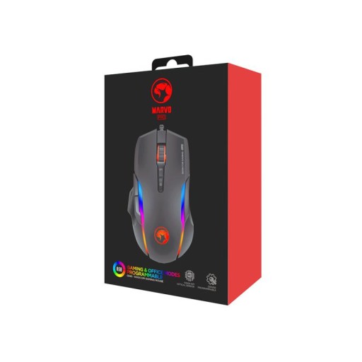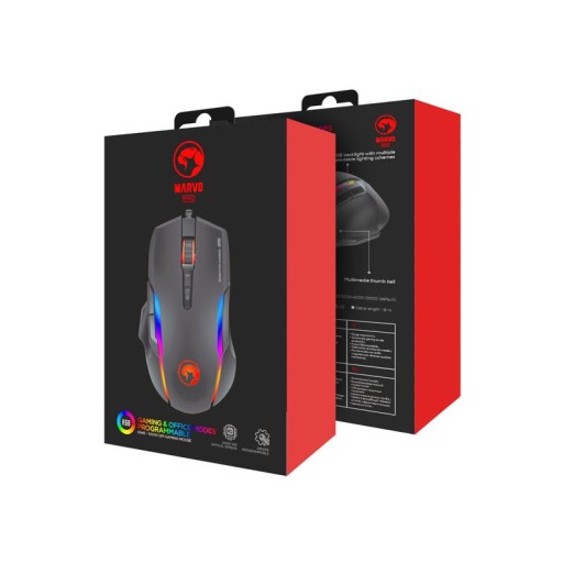 Mysz do gier Marvo G945 Mysz Marvo G945 to gryzoń szczegolnie polecany użytkownikom preferujących uchwyt Palm.Wygodne podparcie całe dłoni pozwala na pewne prowadzenie myszy nawet przy grze z dużą rozdzielczością sensora oraz łatwy dostęp do wszystkich przyciskow. Dodatkowym atutem jest profilowany ergonomiczny kształt i podporka pod kciuk.Atrakcyjny kształt uzupełnia atrakcyjne podświetlenie RGB. Marvo G945 wyposażona została w sensor Pixart 3325DB + BY8948 oraz dedykowane oprogramowanie umożliwiające indywidualną konfigurację ustawień 9 przyciskow myszy czy czułości sensora w zakresie od 1000 do aż 10000 DPI. Sensor posiada częstotliwość odpytywania 1000 Hz.Kolejnym istotnym elementem Myszy Marvo G945 są zastosowane trwałe switche o żywotności nawet 20 mln kliknięć. Dzięki temu użytkownik będzie mogł się cieszyć ponadprzeciętnym czasem użytkowania. Długość przewodu myszy to 180 cm, ktore pozwala na swobodną grę i pracę nawet jeżeli komputer znajduje się pod biurkiem. Aby uzyskać zaawansowaną konfigurację myszy, możesz pobrać i zainstalować specjalistyczny sterownik ze strony alibiuro.Specyfikacja techniczna Czujnik: optyczny Pixart 3325DB + BY8948 DPI: 1000-1600-2400-3200-4000-10000 (domyślnie) Liczba przyciskow: 9 (programowalne) Żywotność przycisku: 20 milionow kliknięć Podświetlenie: RGB Częstotliwość odpytywania: do 1000 Hz Połączenie: USB 2.0 Długość kabla: 1,8 m Wymiary: 127 x 76 x 40 mm