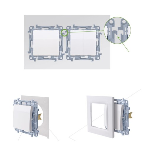 - Czterostopniowe zatrzaski na każdej ramce zapewniają równe przyleganie ramek do nierównych ścian. Również zamontowane w puszkach do ścian karton-gips nie powoduje odstawania osprzętu Simon 10 od ściany.