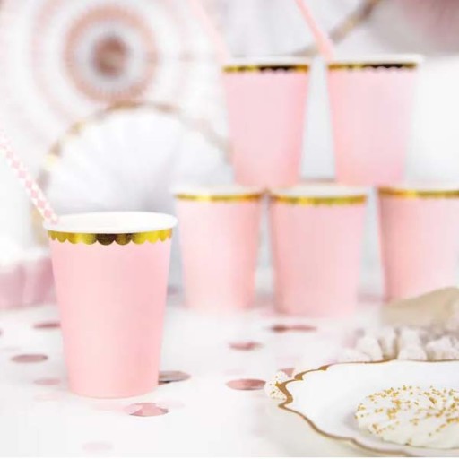 Kubeczki papierowe w kolorze jasnoróżowym ze złotymi metalizowanymi brzegami, pojemność ok. 220 ml. Kubki na napoje zawierają oznaczenia wymagane przez Rozporządzenie wykonawcze Komisji (UE) 2020/2151 z dnia 17 grudnia 2020 r. ustanawiające zasady dotyczące zharmonizowanych specyfikacji w odniesieniu do oznakowania produktów jednorazowego użytku z tworzyw sztucznych wymienionych w części D załącznika do dyrektywy Parlamentu Europejskiego i Rady (UE) 2019/904 w sprawie zmniejszenia wpływu niektórych produktów z tworzyw sztucznych na środowisko. Produkt zawiera etykietę wyłącznie w języku polskim, niemieckim, czeskim, francuskim, niderlandzkim, słowackim, słoweńskim i bułgarskim.