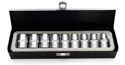- 9 kluczy nasadowych TORX-E 1/2": E10, E11, E12, E14, E16, E18, E20, E22, E24