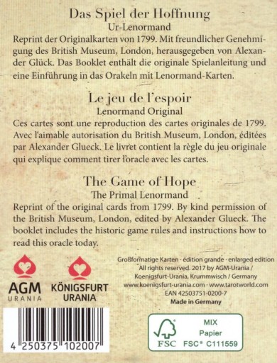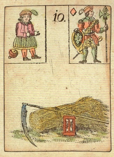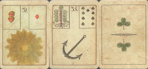To talia, w której spotykamy wszystkie symbole używane później w kartach Lenormand: jeźdźca, bociana, myszy, ryby, itd