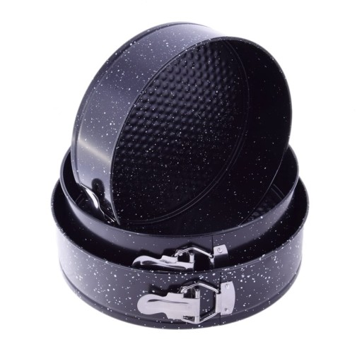 Zestaw trzech form do pieczenia wykonanych ze stali węglowej pokrytej warstwą "non stick", ułatwiającą wyjmowanie ciasta.