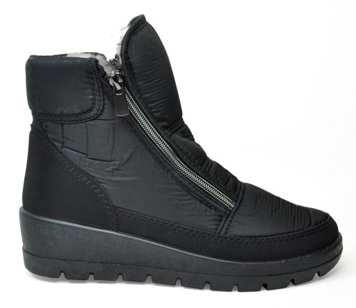 Eleganckie buty ocieplane-śniegowce na chłodne jesienno-zimowe dni, które zapewnią stopie komfort, miły i ciepły mikroklimat, a Tobie zadowolenie. Elegancki wygląd śniegowców uzupełni doznania. Cholewka wykonana jest z nieprzemakalnej tkaniny syntetycznej, wykończona od wewnątrz sztucznym futerkiem. Wykonana z filcu wkładka jest przyjazna dla stopy i dobrze chroni przed chłodem. Cholewka rozcięta jest z przodu , a w rozcięcie wszyto długi język połączony z cholewką dwoma zamkami. Wstawione zamki pozwalają na łatwe zdejmowanie i wkładanie śniegowca. Cholewka na pięcie i po obwodzie buta jest wzmocniona syntetyczną skórą i jest złączona z podeszwą poprzez jednolite ich zlanie oraz przeszycie. Gruba podeszwa wykonana jest z twardej, elastycznej gumy co zapobiega przechładzaniu stopy od podłoża, i podnosi odczucie ciepła.
