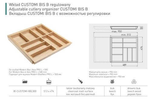 Seria wkładów na sztućce CUSTOMI firmy GTV stanowi praktyczne wyposażenie i dopełnienie szuflad. Wkłady wykonane zostały z wysokogatunkowego drewna bukowego. Wkłady wykończone zostały matowym lakierem, co zapewni dodatkową ochroną przed uszkodzeniami, a także podkreśla i wydobywa ciepły kolor bukowego drewna.