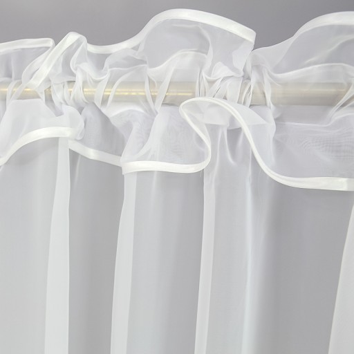 Całość jest ze sobą połączona, uszyta na jednej taśmie marszczącej. W zestaw wchodzą dwie podwiązki umożliwiające upięcie zasłon.