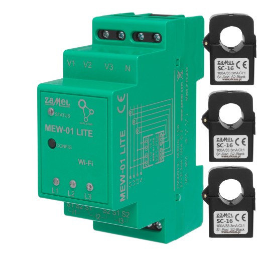 Podczas instalacji na zewnątrz pomieszczeń urządzenie należy umieścić w dodatkowej obudowie hermetycznej i zabezpieczyć przed wnikaniem wody szczególnie od strony zacisków przyłączeniowych. MEW-01 LITE sprzedawany jest w zestawie z trzema przekładnikami SC-16, umożliwiającymi pomiar zużycia na trzech fazach.
