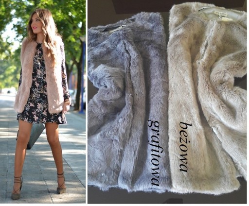 Kamizelka wykonana jest ze sztucznego futerka. Klasyczny, prosty fason. Zapinana na haftkę. Milutka i cieplutka. Po bokach kamizelki kieszonki