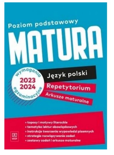Repetytorium jest publikacją przeznaczoną dla uczniów szkół ponadpodstawowych potrzebujących całościowego powtórzenia materiału przed egzaminem maturalnym. Skierowane jest do uczniów ostatnich klas liceum i technikum zdających egzamin maturalny z języka polskiego na poziomie podstawowym w latach 2022/2023 oraz 2023/2024 i zostało tak opracowane, aby uczniowie otrzymali kompleksową pomoc w przygotowaniu do egzaminu maturalnego. Znajdują się w nim: - Najważniejsze pytania i odpowiedzi dotyczące egzaminu ustnego i pisemnego w module Maturalne Q&A. - Lista lektur obowiązkowych na egzaminie ustnym i w części testowej egzaminu pisemnego oraz lista jawnych zadań na egzamin ustny. - Strategie rozwiązywania zadań maturalnych, przydatne podczas egzaminu ustnego, w części testowej egzaminu pisemnego i podczas pisania wypracowania. - Cztery działy z wiedzą teoretyczną, zgodną z podstawą programową i aktualnymi wymaganiami egzaminacyjnymi. Są to: historia literatury, nauka o języku, nauka o literaturze oraz kształcenie kulturowe. Po rozdziałach znajdują się zadania, w praktyce sprawdzające przyswojenie wiedzy. - Omówienia wybranych lektur obowiązkowych (pewniaków maturalnych, takich jak: mitologia grecka, Biblia, III cześć Dziadów Adama Mickiewicza, Lalka Bolesława Prusa, Wesele Stanisława Wyspiańskiego, Inny świat Gustawa Herlinga-Grudzińskiego) oraz najważniejszych tematów, motywów i toposów z lektur obowiązkowych, do wykorzystania na egzaminie ustnym i w wypracowaniu, np. artysta, bunt, czas i przemijanie, dwór szlachecki, katastrofa, konflikt wartości, lud i wieś, młodość, natura, ojczyzna, praca, rodzina, sen, śmierć, tragizm, wina i kara, zdrada, zło, życie. - Dwa zestawy przykładowych arkuszy maturalnych. - Odpowiedzi do zadań po działach oraz do zadań zawartych w części testowej przykładowych arkuszy maturalnych, a także komentarze do tematów wypracowań znajdujących się w arkuszach. - Indeks pojęć z działów z wiedzą teoretyczną. - Zestaw porad, podpowiedzi i wskazówek nauczycielki polonistki, autorki vloga Zeszyt do polskiego, dotyczących praktycznego wykorzystania informacji zawartych w części teoretycznej repetytorium.