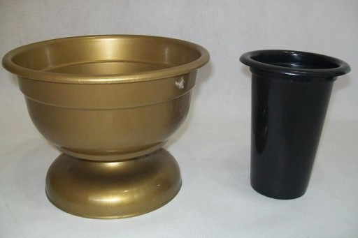 ZDJĘCIE SAMEJ DONICZKI PLASTIKOWEJ I FLAKONU NA KTÓRYCH JEST WYKONANA KOMPOZYCJI I BUKIET DO WAZONU