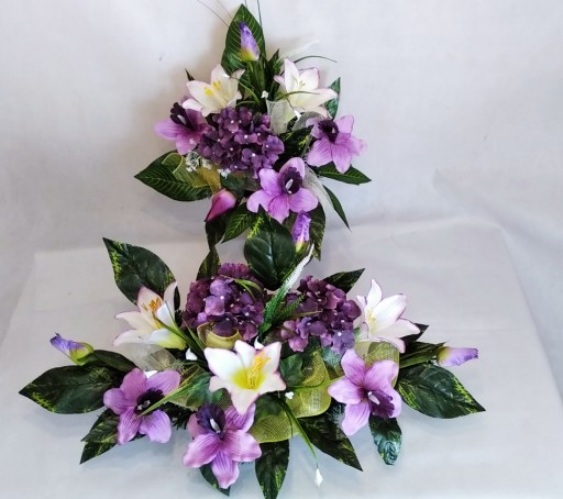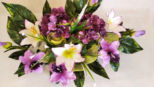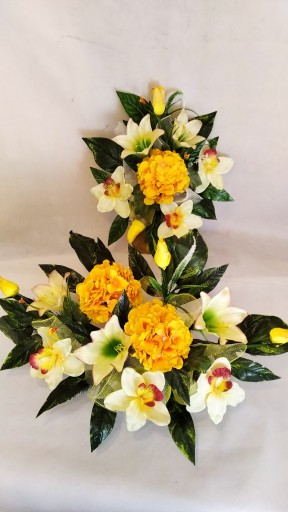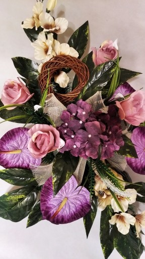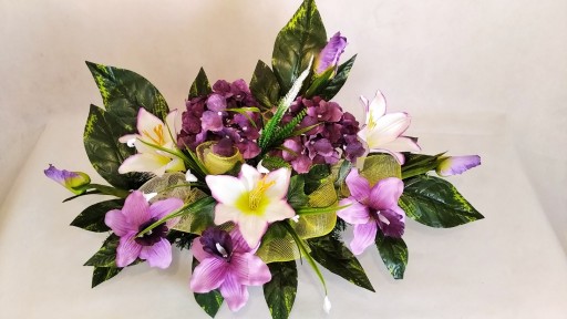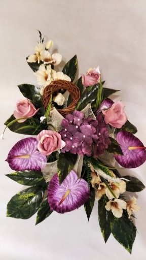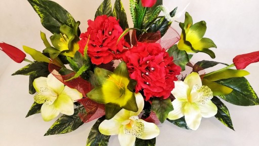 Kompozycja sztuczna (tzw. stroik, ikebana) jest wykonana z sztucznej choiny w DONICZCE PLASTIKOWEJ co daje jej stabilność.